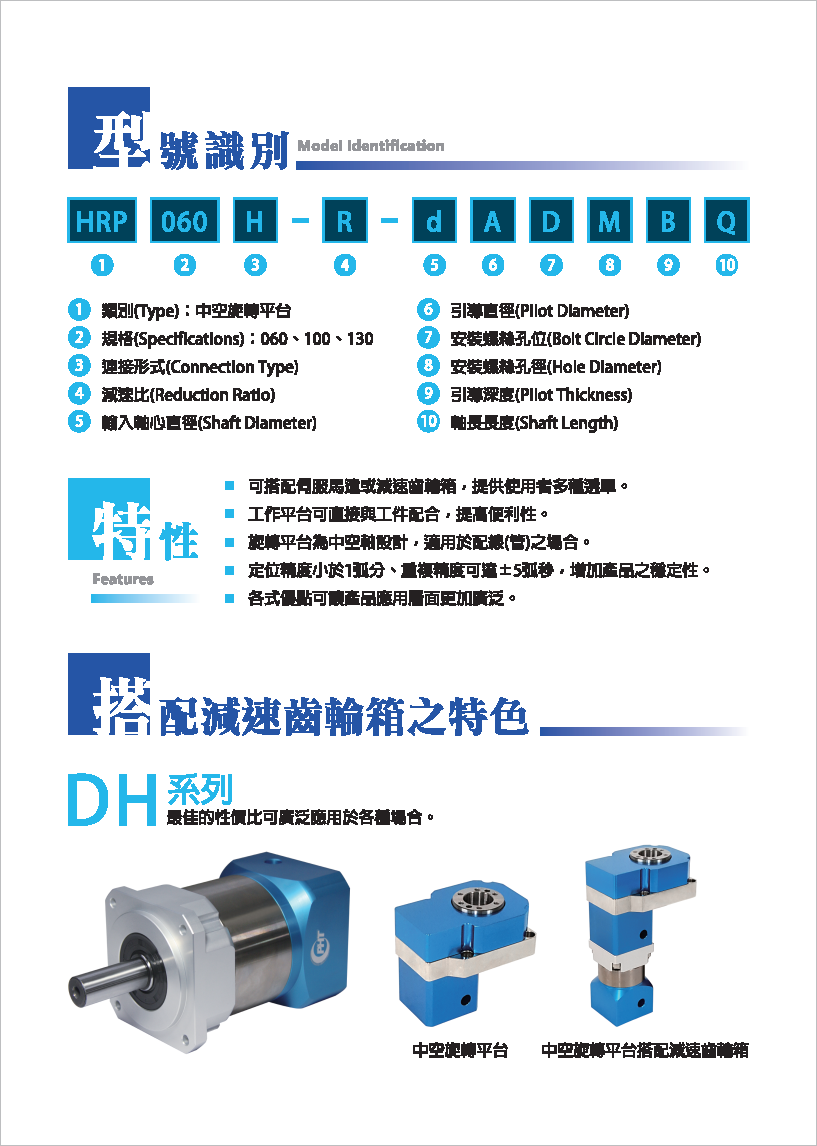 HRP系列是品宏轉(zhuǎn)角減速機系列。 可搭配伺服馬達或減速齒輪箱,提供使用者多種選擇。 工作平臺可直接與工件配合,提高便利性。 旋轉(zhuǎn)平臺為中空軸設(shè)計,適用于配管之場合。 定位精度小于1弧分,重復(fù)精度可達±5弧秒,增加產(chǎn)品之穩(wěn)定性。 各式優(yōu)點可讓產(chǎn)品應(yīng)用層面更加廣泛。