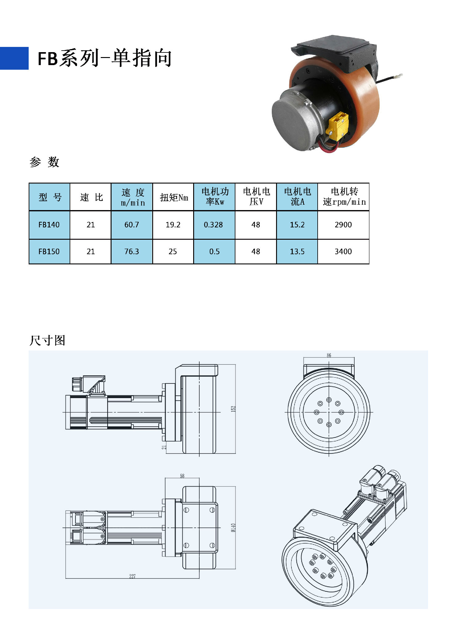 FB系列舵輪組,單指向型。差速驅動輪組模塊,在原有舵輪組的基礎上,進行深度設計,將減速機和驅動輪設計一體化,加外接直流電機,成為高度集成的機電一體化AGV行走驅動輪組組件。